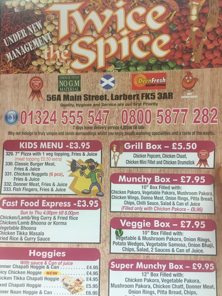 Welcome to Twice The Spice, your go-to destination in Larbert for a tantalizing blend of flavors and culinary craftsmanship. Located at 56A Main St, our menu offers a delightful array of European and Indian dishes, designed to satisfy every palate.